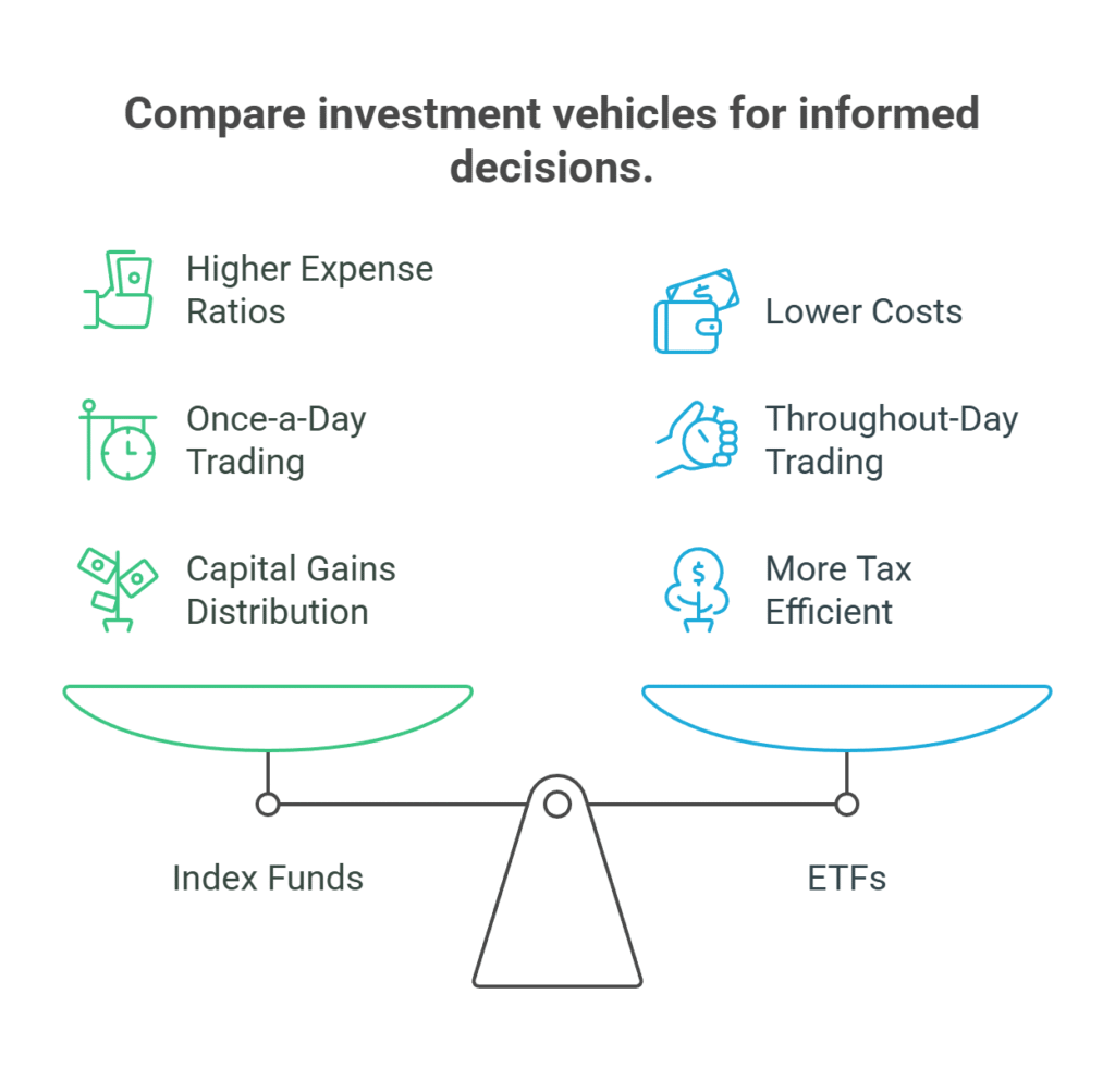 However, ETFs may involve small brokerage trading fees, depending on your platform, whereas many index funds allow free automatic investments, making them ideal for dollar-cost averaging with small, consistent contributions.